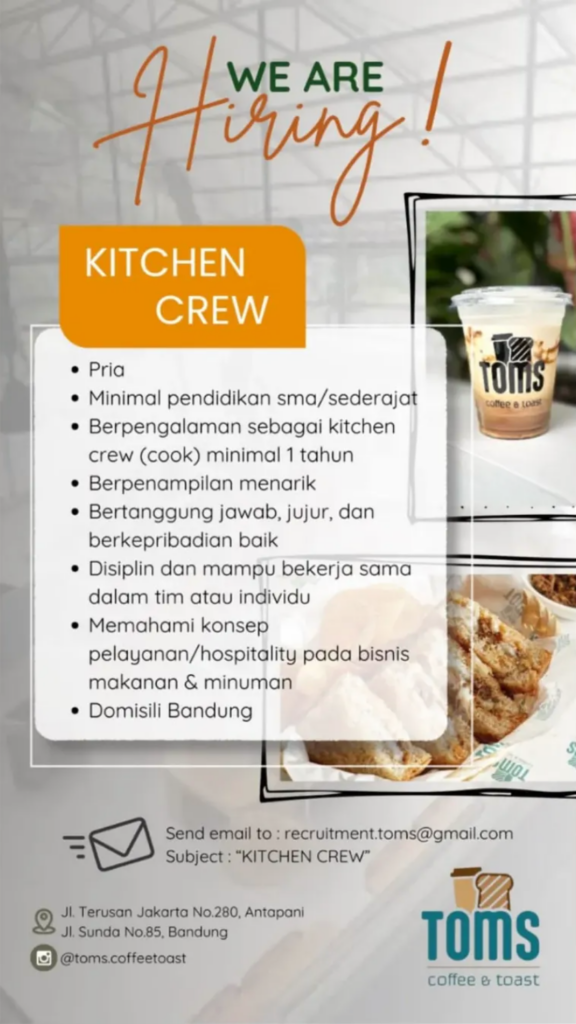 Jangan sampai melewatkan kesempatan ini! Jika kamu merasa cocok dengan posisi Kitchen Crew di TOMS Coffee & Toast, segera kirimkan lamaran dan wujudkan impianmu berkarier di dunia kopi.