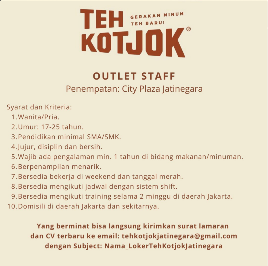 Jangan lewatkan kesempatan untuk bergabung dengan Teh Kotjok City Plaza Jatinegara dan menjadi bagian dari tim yang solid! Jika kamu merasa cocok dengan posisi Outlet Staff, segera kirimkan lamaran sebelum kuota terpenuhi.