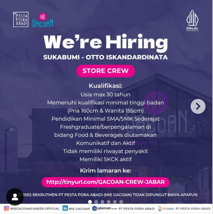 Kalau kamu merasa cocok untuk bergabung sebagai Store Crew di Mie Gacoan Sukabumi, langsung aja kirim lamaran kamu sekarang juga sebelum posisi penuh!