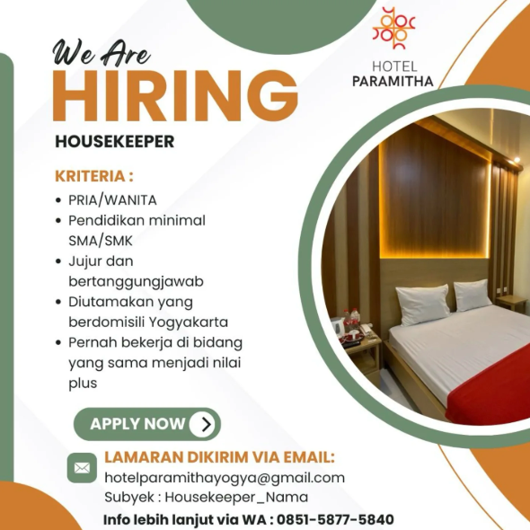 Sedang mencari peluang karier di dunia perhotelan? Hotel Paramitha Yogyakarta membuka kesempatan untuk kamu yang ingin bergabung sebagai Housekeeper! Jika kamu teliti, cekatan, dan punya semangat untuk memberikan pelayanan terbaik bagi tamu, ini saat yang tepat untuk bergabung bersama kami. Yuk, simak informasi lengkapnya di bawah ini dans egera ambil langkah menuju karier di industri hospitaly!